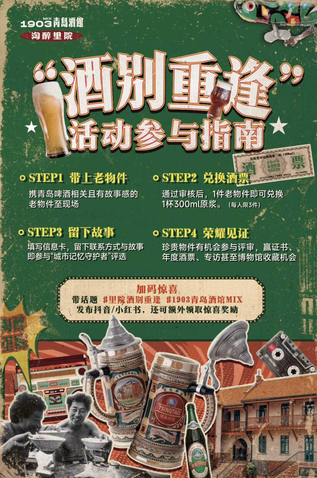 携带与青岛啤酒相关、保存完好的老物件(如酒瓶、酒标、杯具、海报、票证、纪念品等),经现场认证通过,即可兑换“酒票”1张,凭票免费领取300ml青岛啤酒原浆一杯!(每人最多兑换3件)